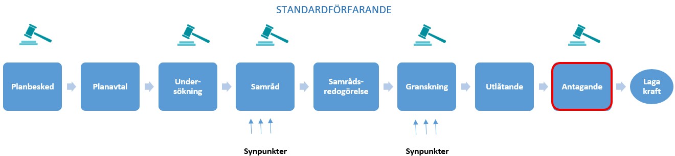 Kommunen handlägger ärendet med s.k. begränsat standardförfarande, vilket innebär att planprocessen kan förkortas om samtliga i samrådskretsen aktivt godkänner förslaget under samrådet. Då behöver inte granskning genomföras utan planen kan antas direkt.
